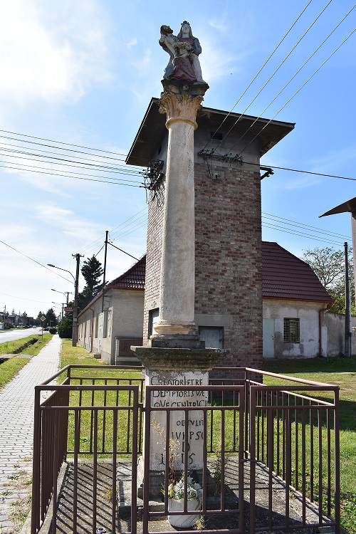 „Svojmu Spasiteľovi a Vykupiteľovi a Bohorodičke venuje Ján Valentín Krajčirovič, farár Sv. Jura. A D 1715 (kňaz pôsobiaci v rokoch 1705-1737). Skratka v nápise IVKPSG sú počiatočné písmená z latinského textu: Joanus Valentinus Krajcirovic parochus Sancti Georgi.