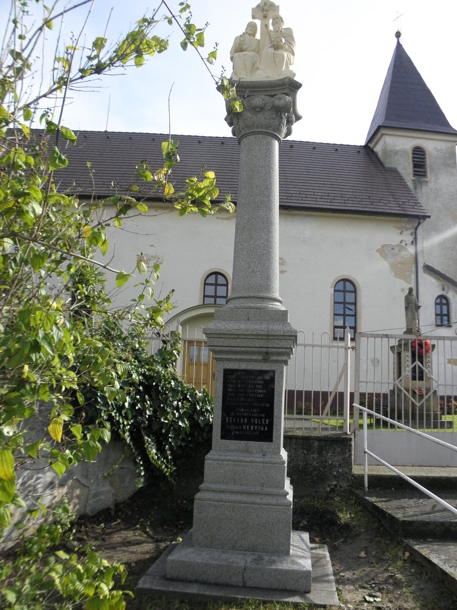 Zakladateľom kríža pri kostole, ktorý sa nachádza vpravo mal byť v roku 1873 Adam Lanža. Podľa nápisu na podstavci nechal kríž postaviť Michal Lanža.