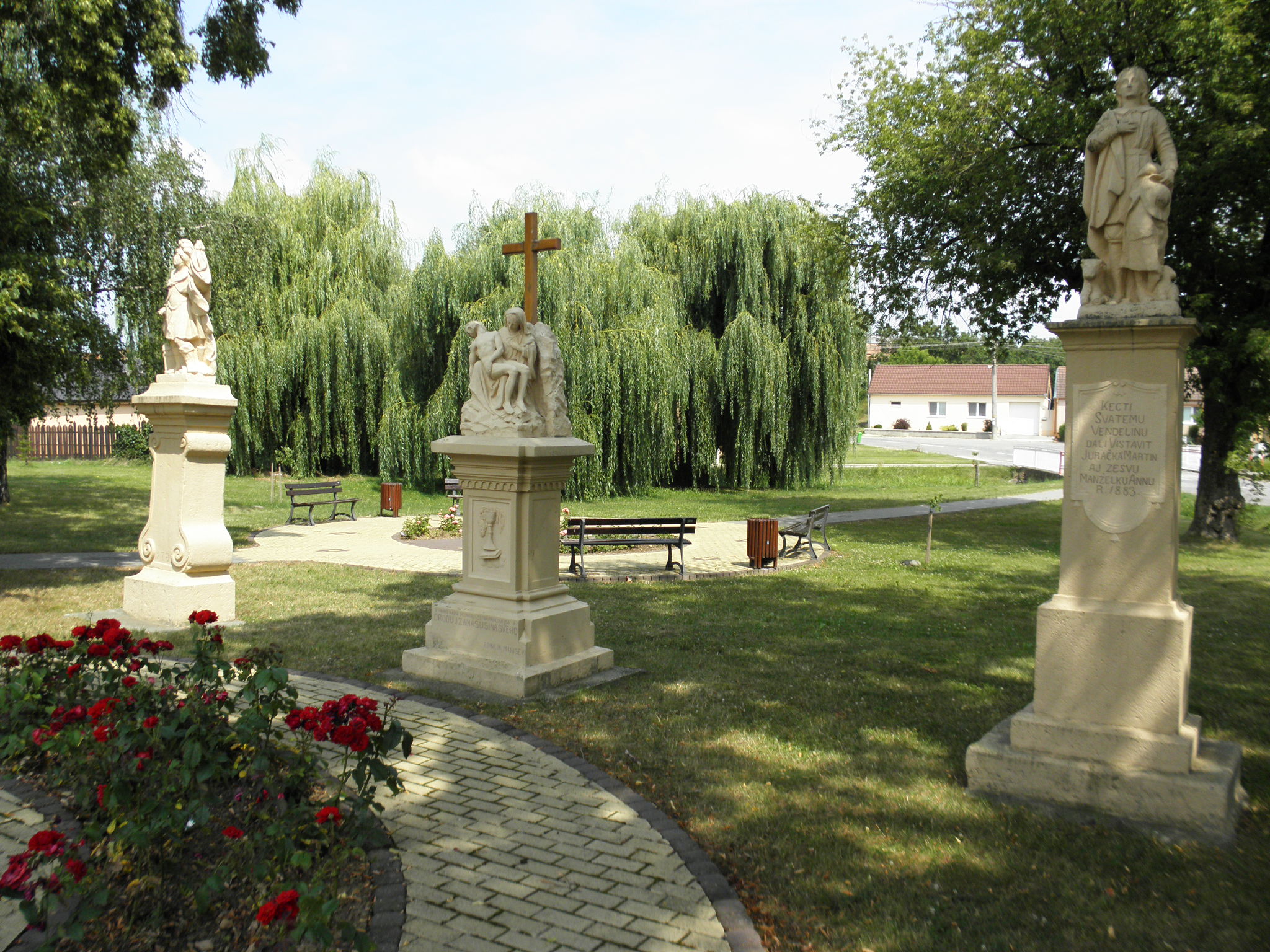 Vpravo je kamenná klasicistická socha sv. Vendelína, patróna pastierov a roľníkov, ktorú dal podľa nápisu na podstavci postaviť Martin Juračka s manželkou Annou v roku 1883, no základinu na sochu venoval už v roku 1881